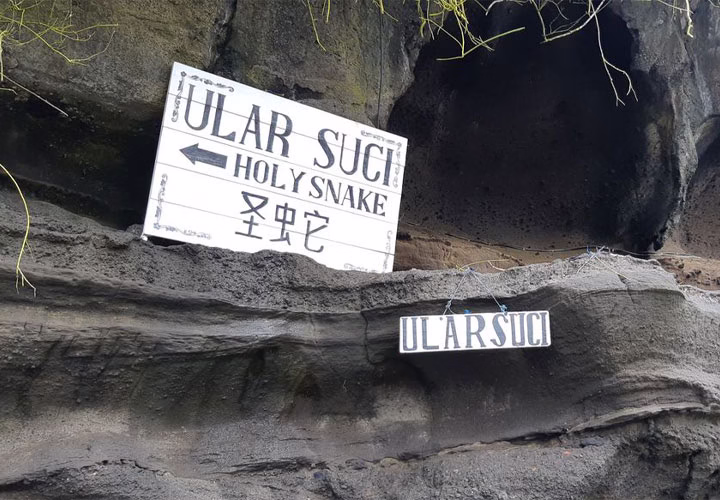Ketika air laut surut, pengunjung dapat melihat sebuah gua kecil yang terletak di seberang pura. Gua ini dipercaya sebagai tempat bersemayamnya ular laut suci yang dianggap sebagai penjaga Pura Tanah Lot. Di dalam gua, wisatawan dapat melihat ular besar yang dijaga oleh seorang pawang. Pengunjung bahkan diperbolehkan mengelus ular tersebut sambil memohon keberuntungan dengan memberikan donasi secara sukarela.